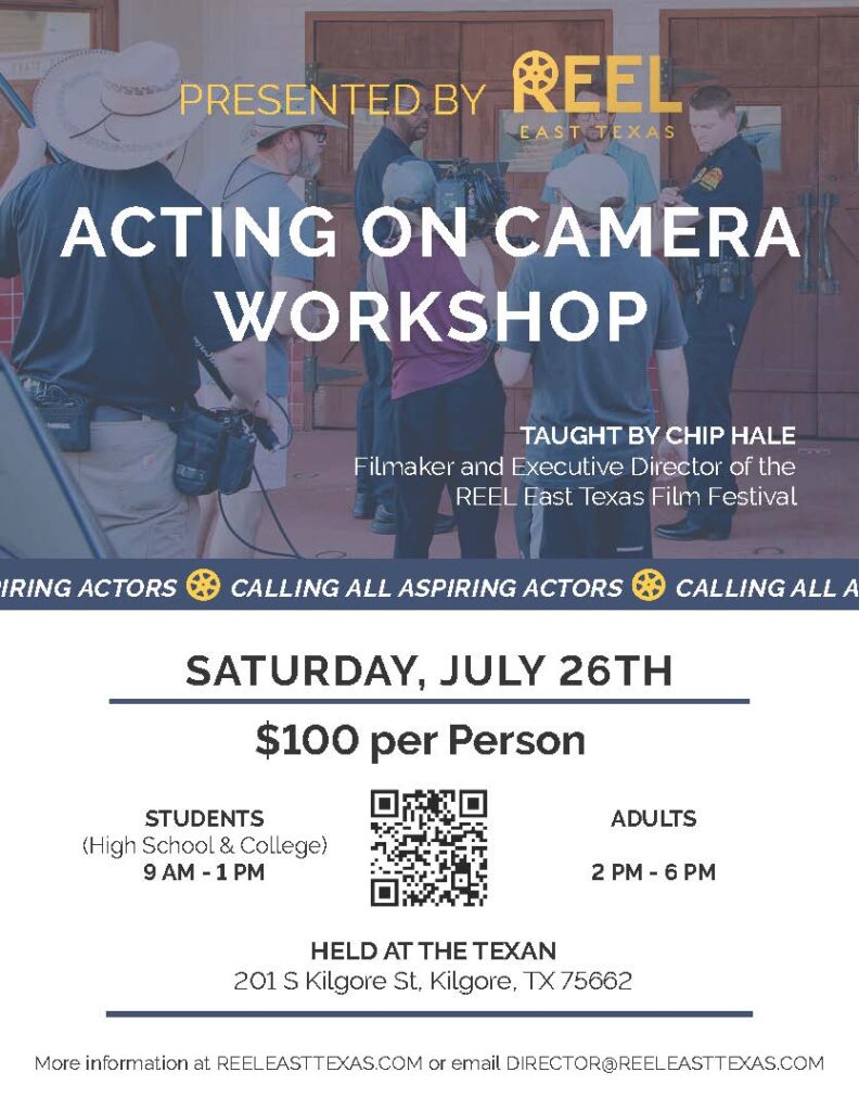 “As REEL East Texas continues to delve into making films ourselves, producing local film projects, we need a roster of actors,” Hale said. The Kilgore-based nonprofit was fortunate to find an excellent crop of local and visiting actors for its first short film, 2023’s Through the Ghost, and more scripts are waiting for the right players. “Right now, we have three screenplays in pre-production. When the time presents itself and REEL has the means to make those films, we are going to need actors.”