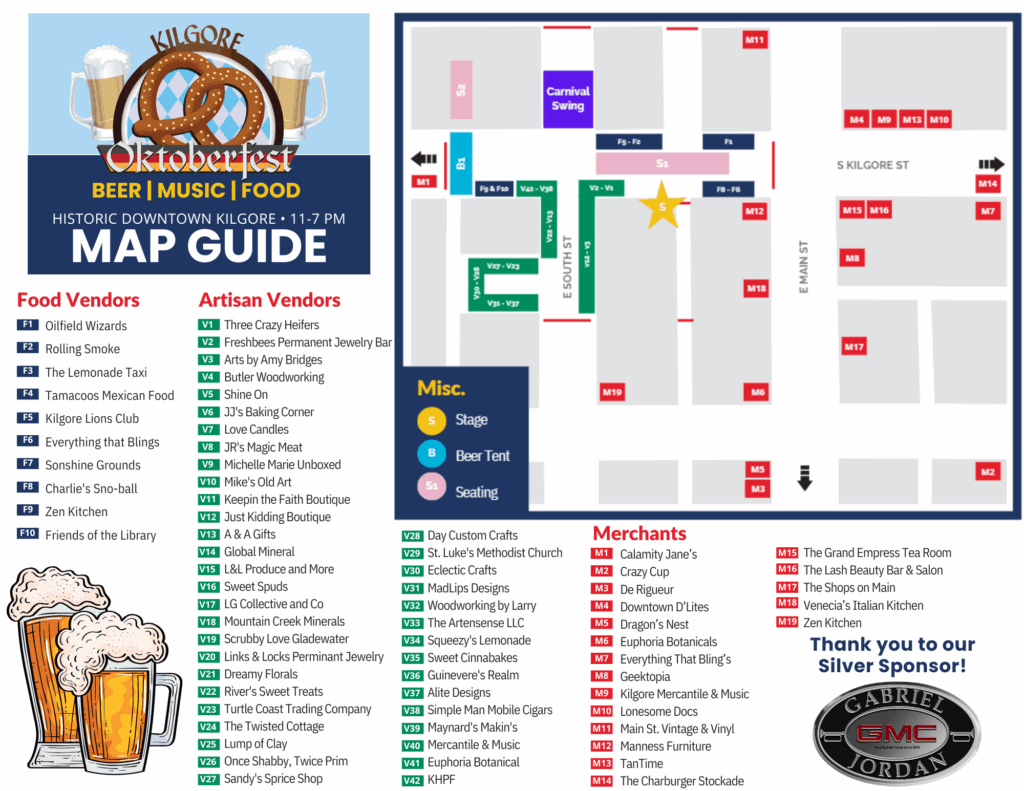 Kilgore Oktoberfest is hosted by the City of Kilgore’s Main Street in partnership with REEL East Texas Film Festival, for whom beer sales serve as a fundraiser to support their programs. Beer garden tickets can be purchased in advance at https://givebutter.com/7DizgW. Additional support comes from local sponsor Gabriel Jordan Buick GMC and the city staff/volunteers who have helped make the event a downtown tradition for a decade.