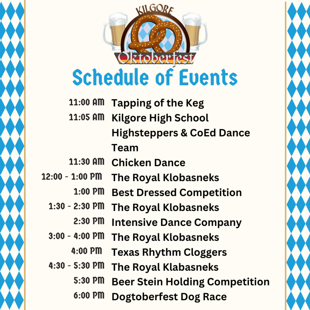 “Kilgore Oktoberfest started as a dream of our former City Manager, Josh Selleck, who was inspired after experiencing the authentic Oktoberfest in Germany,” said Megan Payne, Kilgore Tourism and Marketing Manager. “We are grateful to our current City Manager, Rachel Rowe, and the City Council for continuing to support this event, which has become a beloved event that brings our community together.”